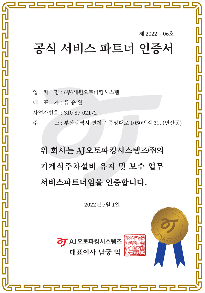 공식 파트너 인증서(AJ오토파킹시스템즈)